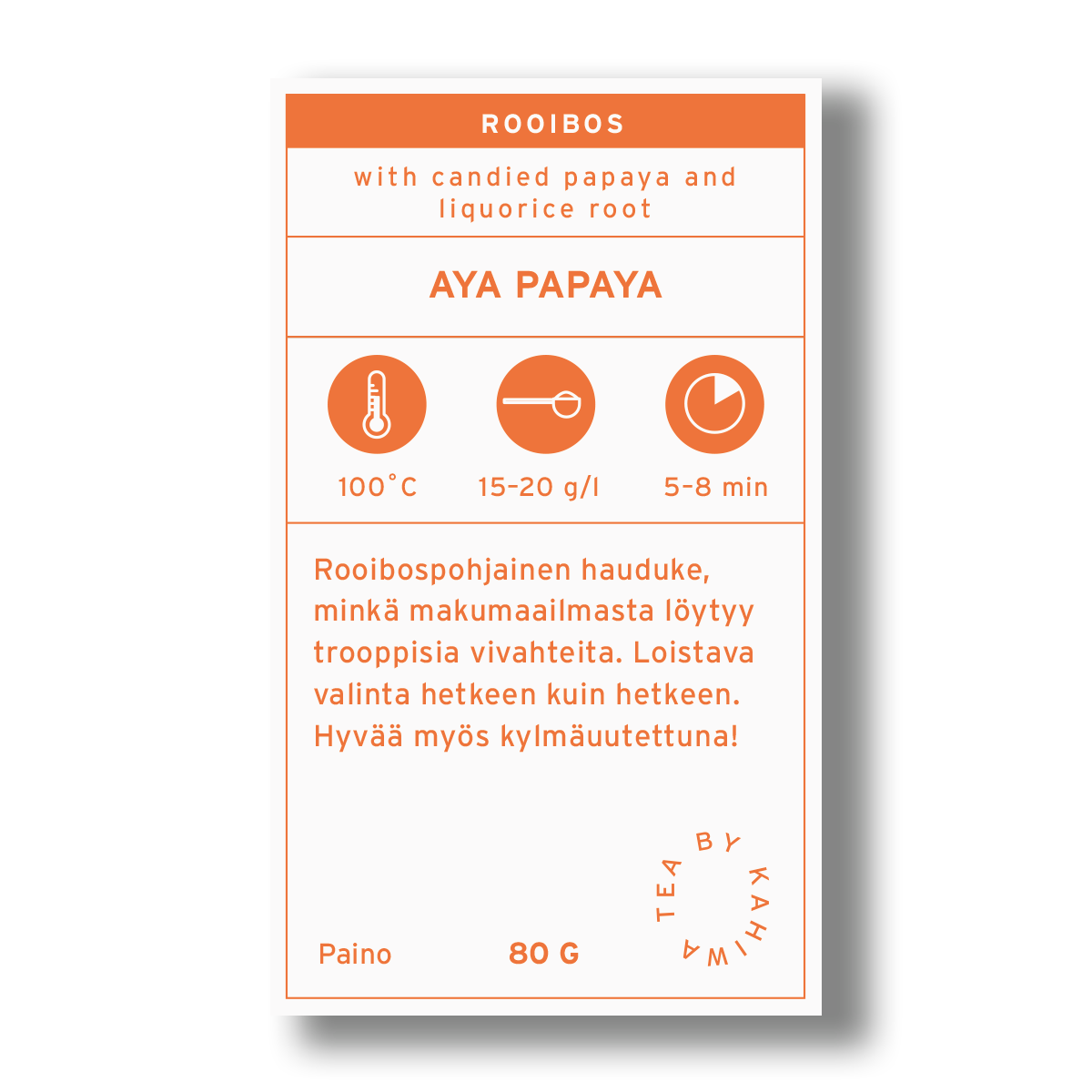 Aya papaya on rooibospohjainen hauduke, minkä makumaailmasta löytyy trooppisia vivahteita karamelisoidun papaijan ja lakritsijuuren saattelemana.
