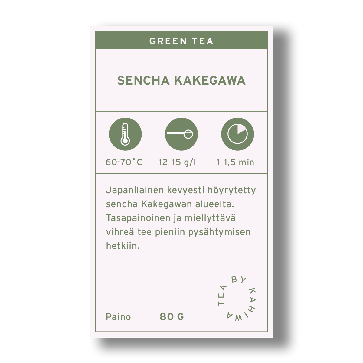Japanilainen kevyesti höyrytetty sencha Kakegawan alueelta. Erittäin tasapainoinen ja miellyttävä vihreä tee pieniin pysähtymisen hetkiin.
